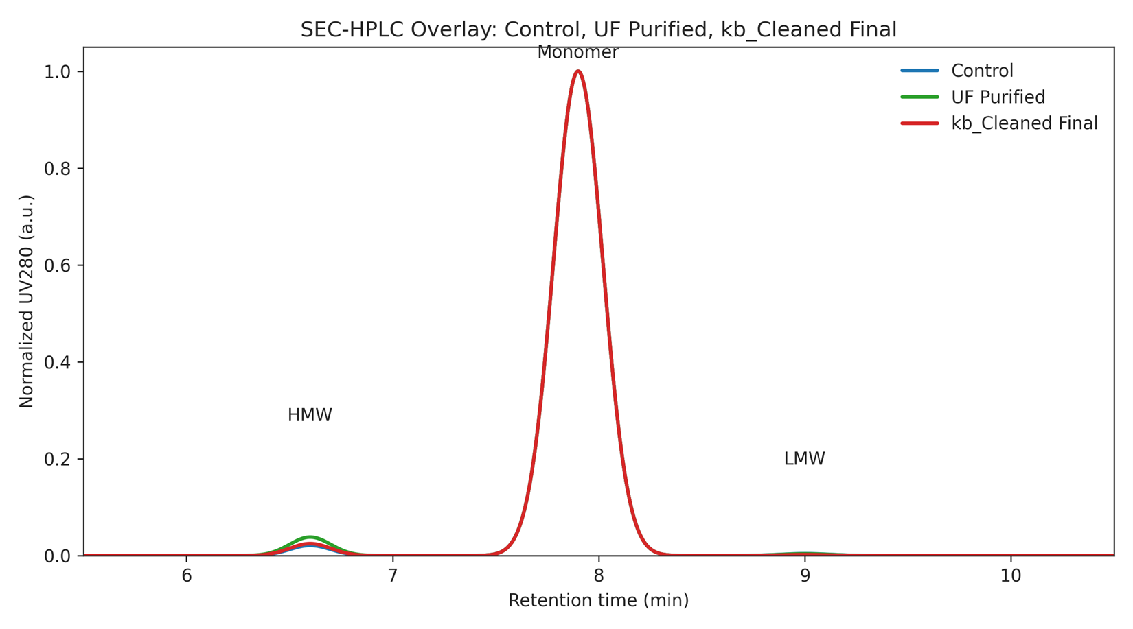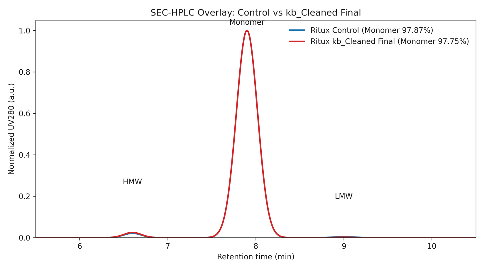 Figure 1. SEC-HPLC overlay (Control vs kb_Cleaned Final). Normalized UV280; monomer near ~7.9 min.