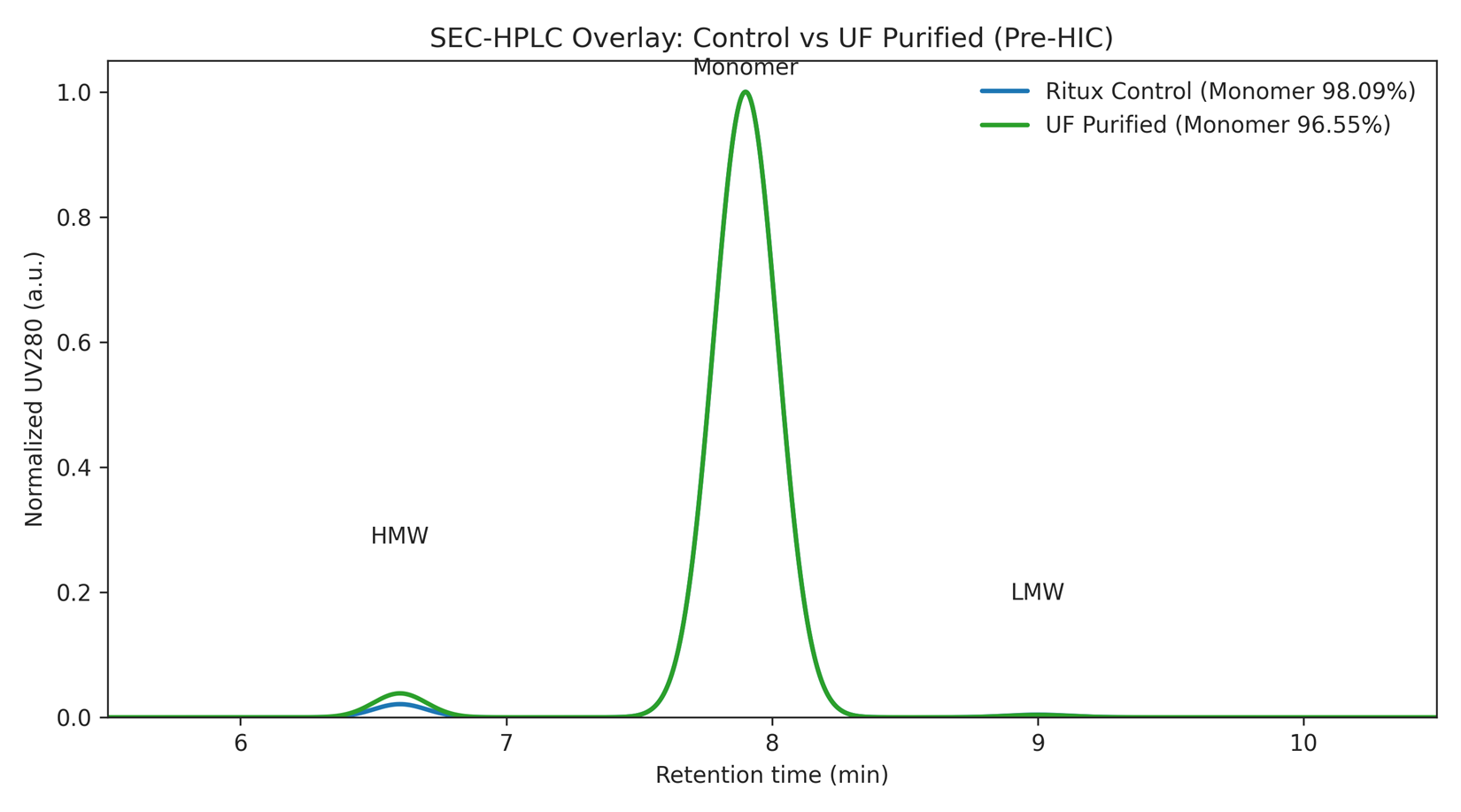 - Problem statement: 5 g of rituximab biosimilar (IgG1, RUO) arrived at ~96.5–97% monomer; the assay gate required approximately ≥97.5–99% monomer depending on use. The team targeted a ~1–2% monomer increase by removing HMW species without excessive loss.