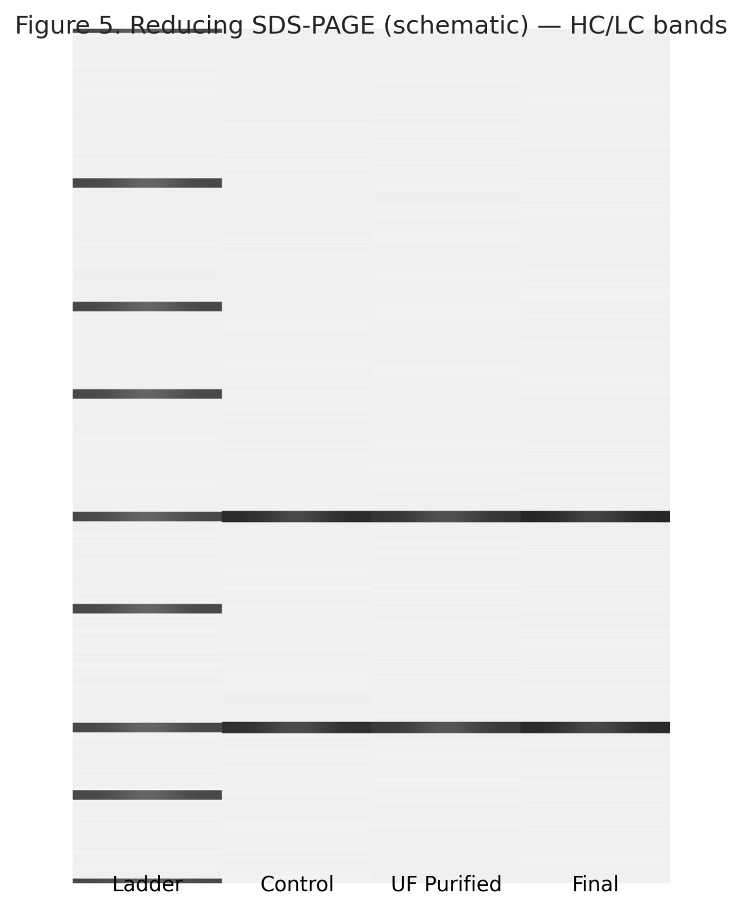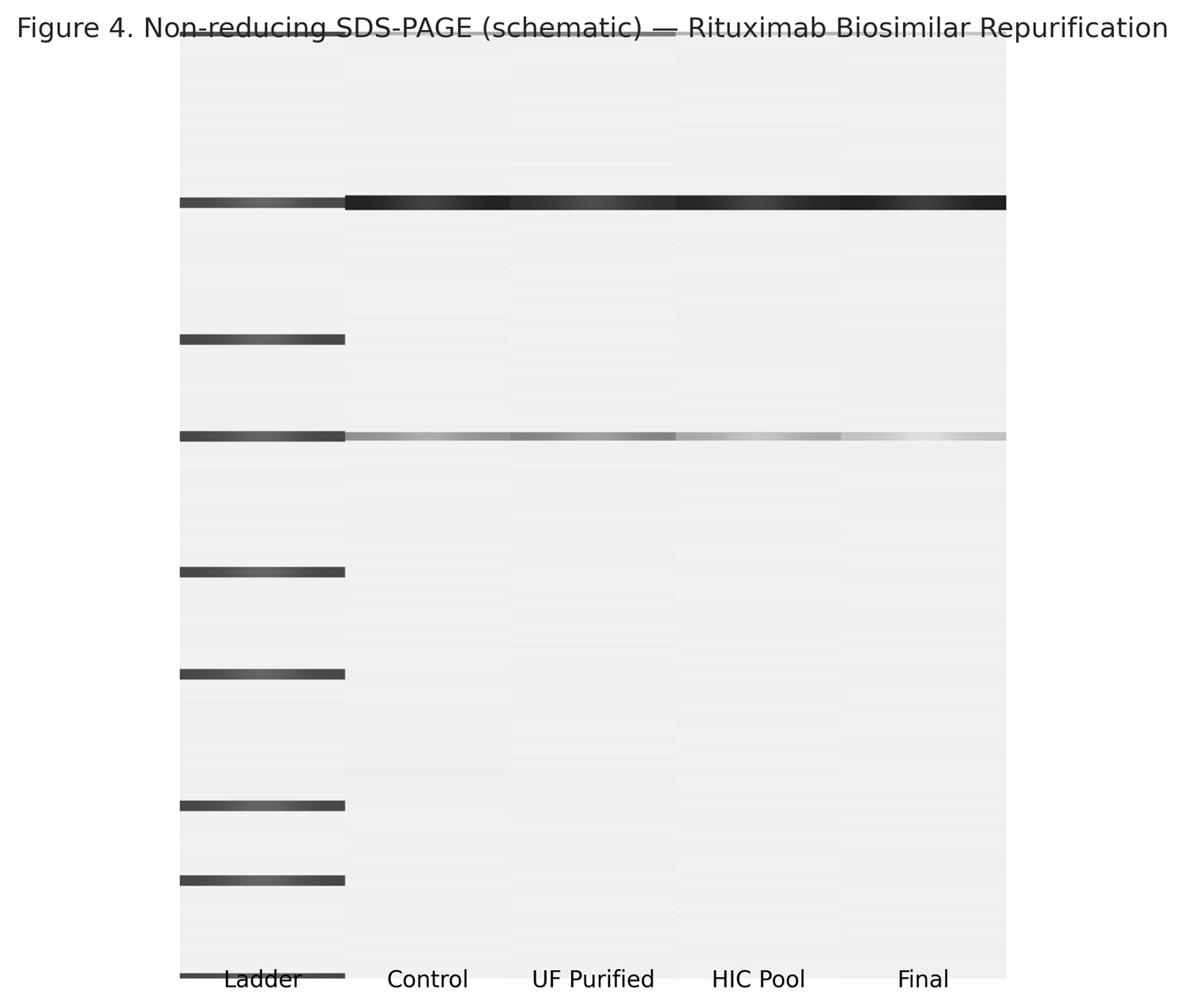 Figure 4. Non-reducing SDS-PAGE schematic: lanes ladder, control, UF, HIC pool, final.